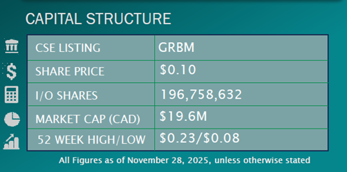 As of December 19, 2025, the GRBM chart shows it is trading near CA$0.09. Price has stabilized after a steady decline, and selling pressure appears to have diminished. The 50-day moving average, currently near CA$0.11, and the 200-day moving average, near CA$0.14, are both flattening. This loss of downside slope typically marks the transition from a downtrend to a neutral or basing phase.