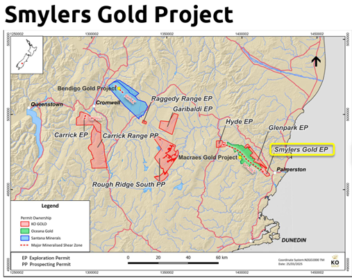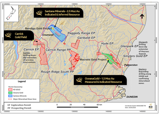 Unlike many early-stage explorers that scatter their efforts across multiple jurisdictions, KO Gold has taken a highly concentrated approach. The company controls a large land package in the Otago Gold District covering approximately 400 square km through four active exploration permits at Carrick, Hyde, Glenpark, and Smylers, all within close proximity to OceanaGold's active Macraes Gold Mine and near-term producer Santana Minerals' Bendigo-Ophir Project. In addition, KO Gold has an exploration permit application in the Carrick Range area awaiting final approval from the NZ government, located immediately south and contiguous with its Carrick permit. The Company also has a net smelter royalty (NSR) on three additional permits (Garibaldi, Raggedy Range, and Rough Ridge South) totaling 340 square km. This gives it exposure to multiple gold systems within a single, well-understood geological belt.