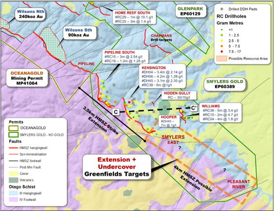 Smylers lies directly on strike from the Macraes Gold Mine along the Hyde-Macraes Shear Zone, a major gold-bearing structure extending for more than 30 km. Macraes itself was the asset that transformed OceanaGold from a junior into a mid-tier producer.