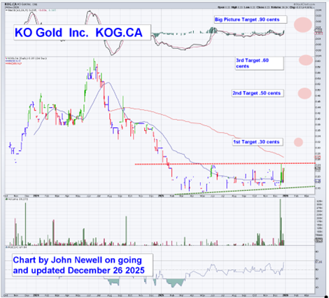 In summary, KO Gold is setting up as a speculative breakout candidate. The base is established, volume has started to confirm, and the chart has clearly defined targets at CA$0.30, CA$0.50, CA$0.60, with a big-picture objective near CA$0.90 if the next leg is supported by catalysts.