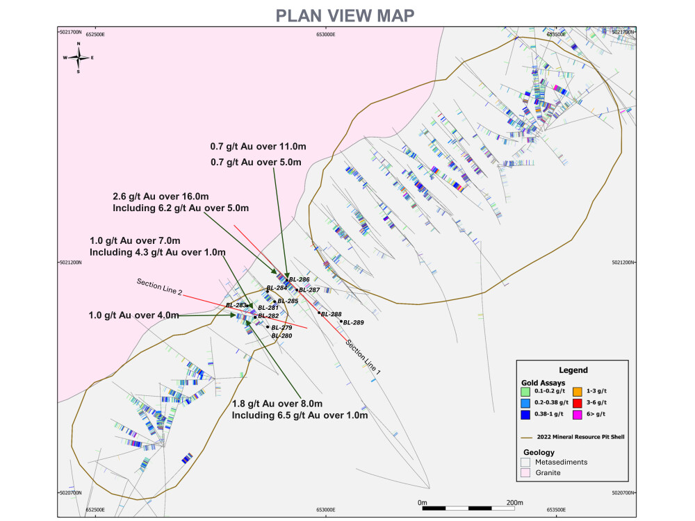 Holes BL-279 through BL-282 confirmed the presence of gold mineralization beneath the current outlines of the westernmost resource pit. For example, BL-279 returned 1 gram per ton gold (1 g/t Au) over 7 meters (7m). These results suggest that the existing resource pits could be connected and that the Southwest deposit could be expanded laterally and at depth.