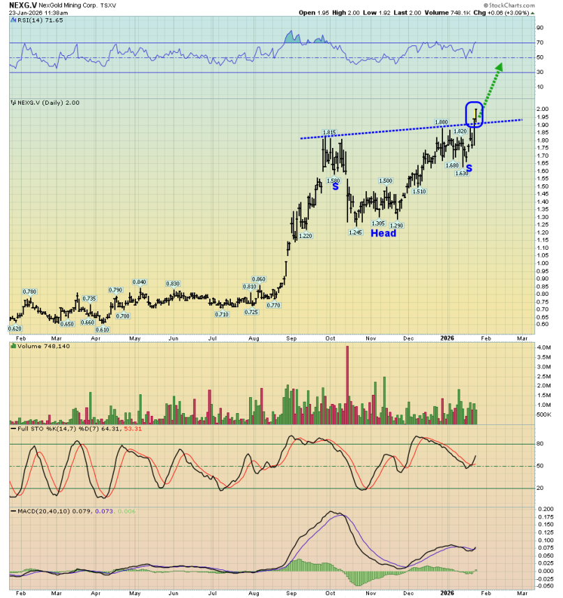 On January 23, newsletter writer Stewart Thomson featured NexGold among his highlighted juniors, writing, "I'm predicting they'll ‘walk the mid-tier talk.'" He added, "Blastoff is here! Note the Strong Buy signal on the Stochastics oscillator (14,7,7 series) at the bottom of the chart." He described NexGold's jurisdiction and management positively and noted strong technical momentum.