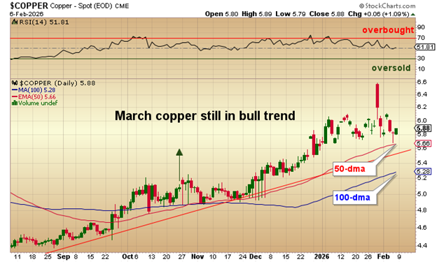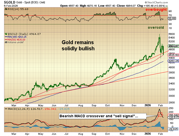 After all the gnashing and gnarling of teeth last weekend, gold put in a stellar performance by spitting directly into the faces of the bears, holding firm above the 50-dma despite knifing down through it at the January month-end to its intraday low of around $4,400. Gold went out for the week, 12.82% above that low, and registered a 5% recovery for the week.