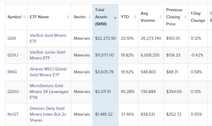 There are advantages to the ETFs, mainly that they give you diversification in the sector, and as an individual investor, you have to do far less due diligence and research. You pay a price for this, but most don't realize it. Below are the top 5 gold stock ETFs by assets under management.