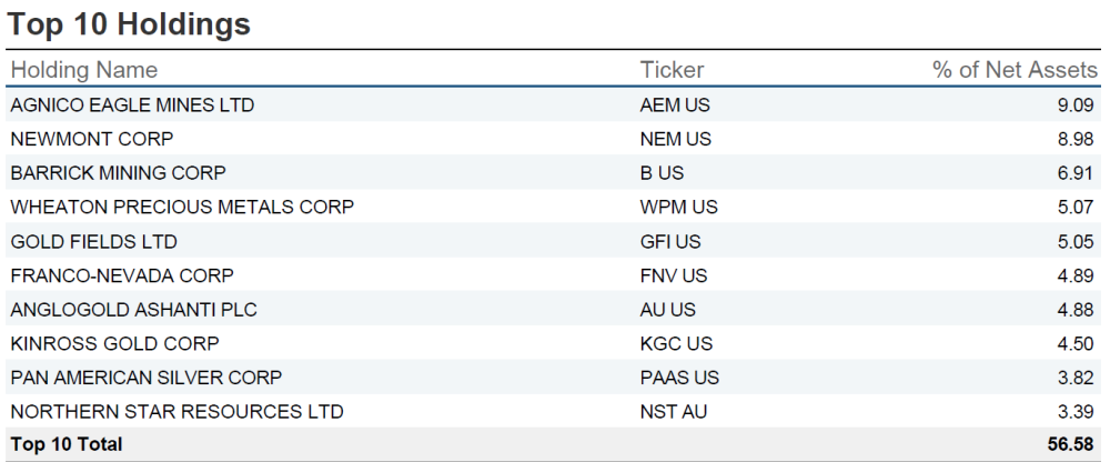 I am going to look at the GDX ( VanEck Gold Miners) ETF that has been around for a long time and is well-known. GDX currently holds 56 stocks, and over 50% of the holdings are the top senior producers, so they will have a major impact on the performance. The ETF will mostly track the large producers.