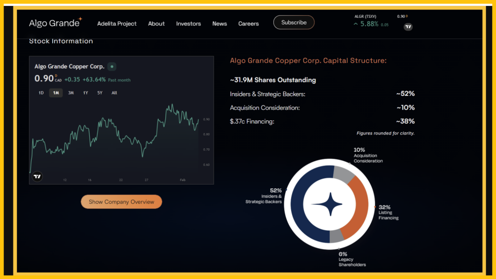 Algo Grande Copper Corp. (ALGR:TSX.V)is a North American exploration company that is advancing the Adelita project.
