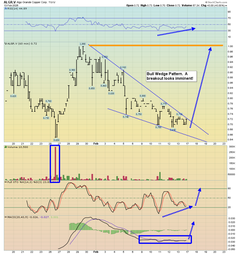 The next news announcement should be the catalyst for the bull wedge breakout and surge to my CA$1.00 short-term target zone… but the chart action is so bullish that it could happen before there's any news.