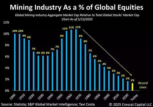 If you believe that your mining stocks are preposterously inexpensive compared to everything else in the world, it might be because they are preposterously inexpensive compared to shares globally. Crescat highlights that if mining shares merely reverted to their 1970 proportion of the total investment market, they would need to increase by 1000%. Unsurprisingly, many will rise even more. We may be in a correction, but this bull has a considerable distance to cover.
