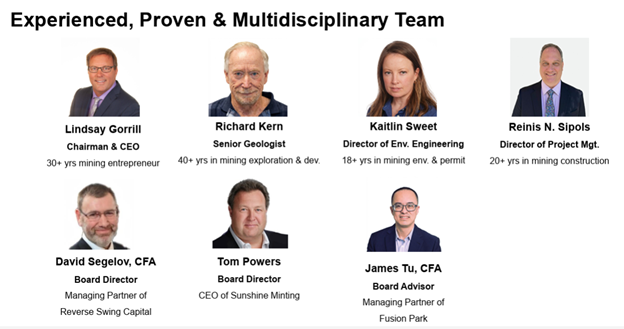 The company is headed by Lindsay Gorrill, Chairman and CEO, a mining entrepreneur with more than three decades of experience in the sector. The board also includes Tom Powers, CEO of Sunshine Minting and a director of the company, as well as David Segelov, CFA, Managing Partner of Reverse Swing Capital.