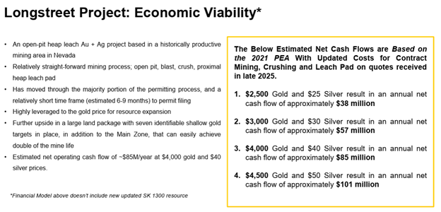 At current gold and silver prices, internal economic models suggest the project could generate an estimated strong operating cash flow once in production. Depending on metal price assumptions, the estimated annual net operating cash flow could range from approximately US$57 million to more than US$100 million per year.
