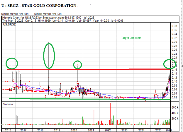 The chart for Star Gold is beginning to show the kind of structure technicians often watch for after a long period of neglect. Following years of quiet trading during the junior mining bear market, the shares appear to have built a broad accumulation base. These long bases are important because they represent a gradual transfer of stock from discouraged holders into stronger hands willing to wait for the next cycle.