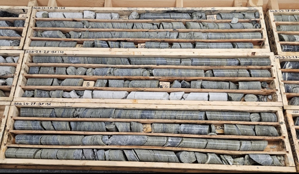 In the release, Golden Cariboo also said it was engaged in active drilling operations at its Quesnelle gold quartz mine property near Hixon in British Columbia, with drill hole QGQ25-28 reaching a depth of 715 meters. During its progression, it has encountered intermittent quartz-carbonate veining, silicification, and both disseminated and stringer pyrite mineralization, as seen in the cores below. This drilling effort is focused northwest of the Halo zone.