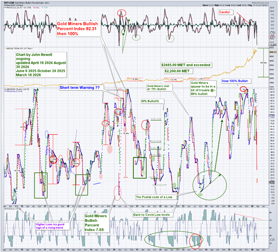The Bullish Percent Index, often referred to by its symbol $BPGDM on StockCharts, is not a price chart. It is a breadth and sentiment indicator. It measures the percentage of gold mining stocks that are currently on Point and Figure buy signals. In other words, it shows how many stocks in the sector are technically in uptrends versus how many have already rolled over.