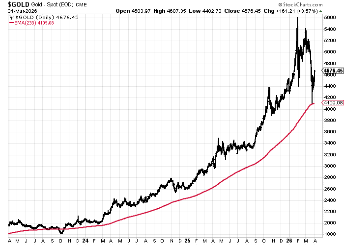 Here is a 3-year chart of gold to put the March move in some perspective. I've also added a very useful indicator — the 233-day exponential moving average — in red.