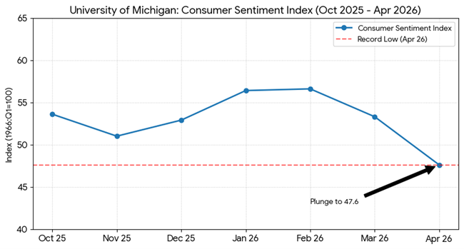 Investor sentiment rises and falls with presidential approval ratings, and one of the ways to gauge overall confidence is through the University of Michigan Consumer Sentiment survey, which here in April just hit a record low at 47.6. What this tells me is that while stocks are currently enjoying a relief rally, overall sentiment is not conducive to a prolonged recovery in prices.