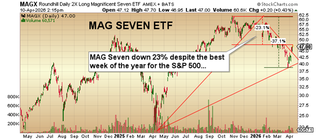 With the double-leverage inverse ETF for the Magnificent Seven group of stocks (MAGX:US) down 37.1% from its November top, this ETF is still down 23.1% even after the best week for stocks in 2026.