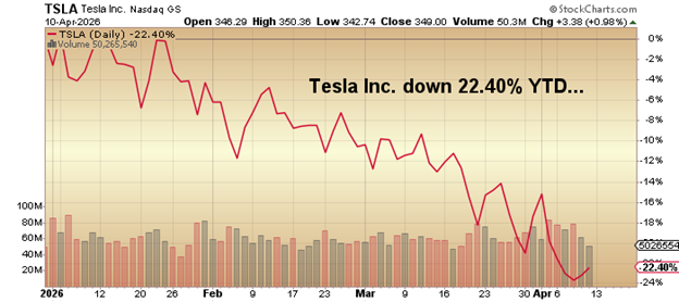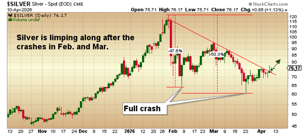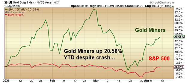 Whether it is the Mag Seven, Bitcoin, or Tesla, the leaders of the post-COVID liquidity binge, aided and abetted by the Fed and the Treasury department, are no longer leading, and as of April 10th, 2026, no real leaders have raised their hands or thrown their hats into the leadership ring. One might say that the gold miners have been taking on the leadership role despite the crash we had in March because it has been the miners that have roared back into gear.