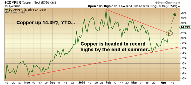 As for my favorite metal — copper — I love the manner in which it is retracing the crash to $5.20/lb. and is now cruising along at $5.85/lb. with $6.00 copper in its crosshairs and that against the backdrop of a cooling global economy and macroeconomic uncertainty flooding the landscape of every continent, irrespective of country.