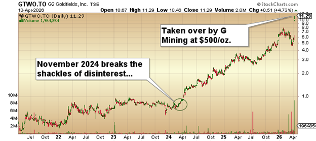 I continue to hold and add to my junior developers and explorers with trading profits generated from other areas, and while it is maddening to sit and watch the junior names do absolutely nothing for weeks on end, experience has taught me to be patient. Take the example of G2 Goldfields Inc. (GTWO:TSXV) that traded from 2020-2024 in the sub-$1.00 range on skimpy volumes and notable disinterest. Then, in November 2024, it broke out above the $1.00 ceiling and for the past two years has been in a steady state of ascent, culminating with a daring offer from G Mining Ventures (GMIN:TSX.V) that has offered to acquire it for approximately US$2 billion in value.