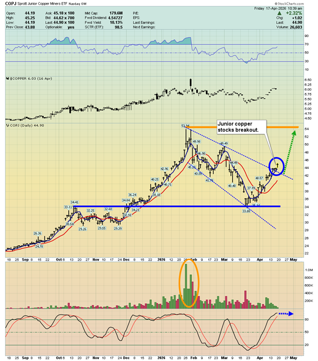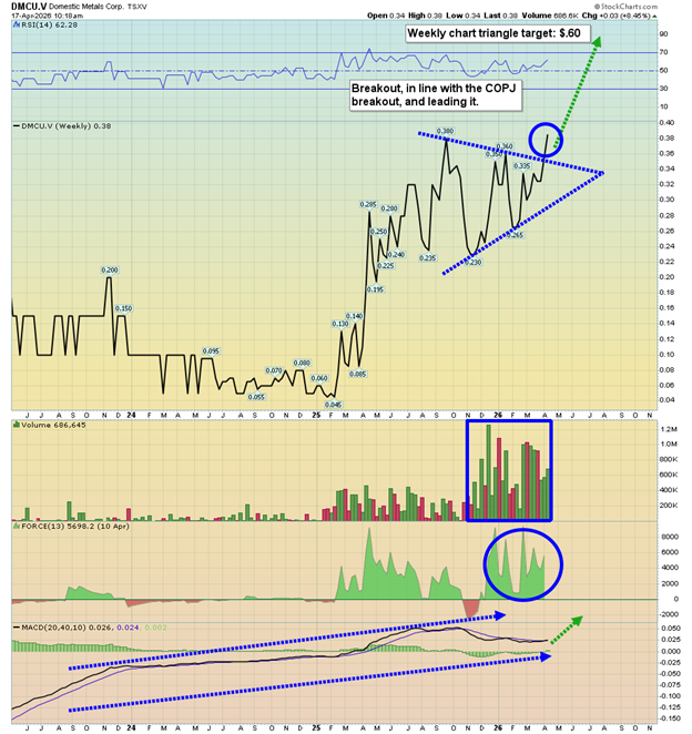 From a technical perspective, the stock has been forming constructive patterns while the broader junior copper sector shows signs of life. The junior copper ETF (COPJ) has broken out of a multi-month consolidation, and Domestic Metals appears to be leading the move, recently trading at new highs.
