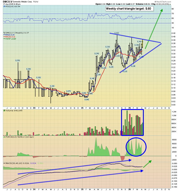 My view: These technical developments, combined with the positive exploration news at Smart Creek, suggest the stock is building momentum. I am maintaining a Speculative Buy rating on Domestic Metals Corp.