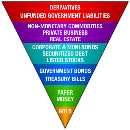 BM: Gold is always the last man standing. John Exter, an economist who worked for the Fed and major banks during the 1960s, had a triangle of resources. He put gold at the very top. When everything else crashed, gold would hold its value.