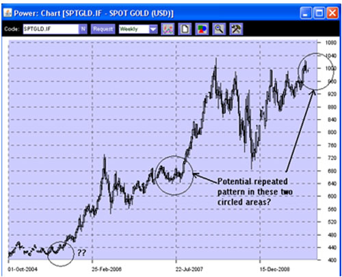 October can be a time of intense nerves in equity markets and so profit taking may have seemed prudent for some investors at this time. Gold however took off in early September in 2005 and 2007 as shown in the circles on the chart below embarking both times on powerful rallies.