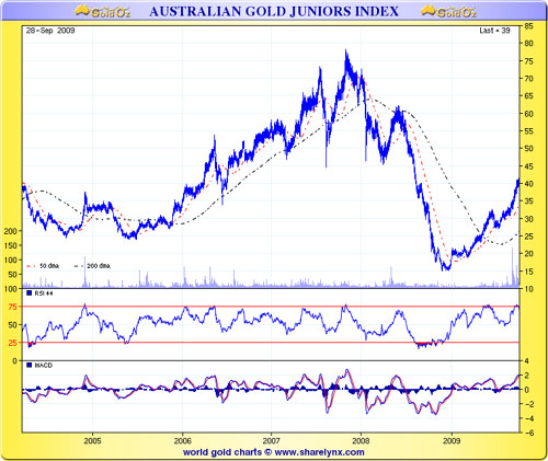 To illustrate how well the smaller stocks are doing now I have included the chart below on the junior Aussie gold stocks. Look how low they are now and wonder how high they will go when gold really takes off over the US$1,030 level and beyond.