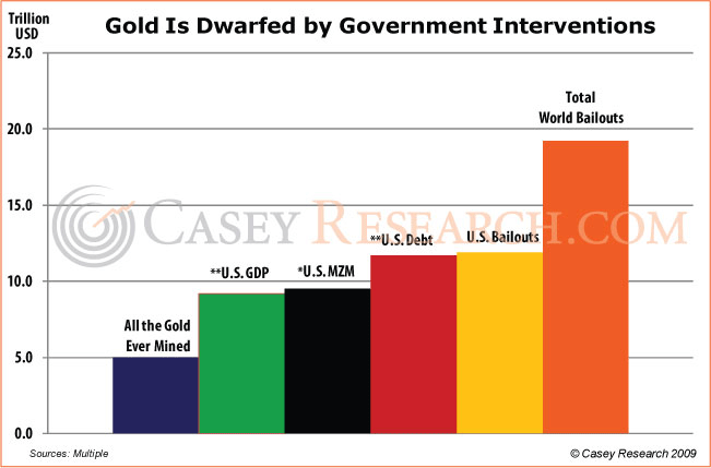 First, let's look at gold. If we added up all the gold ever mined on the planet, its total value would equal no more than $5 trillion at today's prices. Yet, look at how this compares to the debt and bailouts and other monetary mischief of current governments...