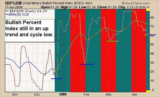 The chart below clearly shows the gold miners BP chart, which has been in a strong up trend since December. The current cycle has just turned up for the gold index indicating we could see higher prices this week.