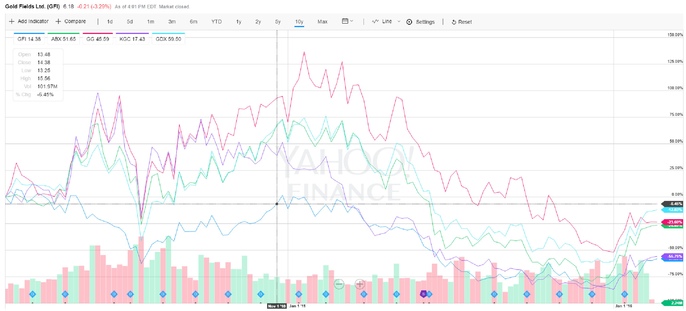 Here is a rough comparison of four of the ten largest gold miners in the world. You can see a huge valuation gap between Goldcorp Inc. (G:TSX; GG:NYSE)/Barrick Gold Corp. (ABX:TSX; ABX:NYSE) and Kinross Gold Corp. (K:TSX; KGC:NYSE)/Gold Fields Ltd. (GFI:NYSE). I understand Goldcorp is one of the best-run gold miners and Barrick is a darling of the funds, but does that justify the huge 100–200% valuation gap? If you believe this gold rally is for real, then I see these stocks converging in the next year or two when investors start to put valuations into their calculations. Here are the ten-year charts for these four stocks versus GDX. I see them converging, which means Kinross and Gold Fields could have 100% upside in addition to any appreciation of GDX.
